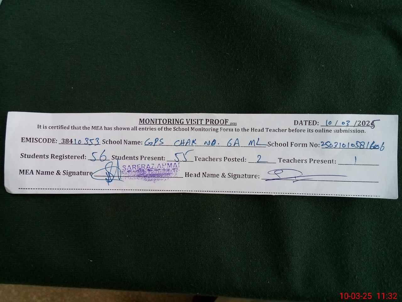 | EMIS Code: 38410353 | Name of School: GPS CHAK NO.6-A ML | |||