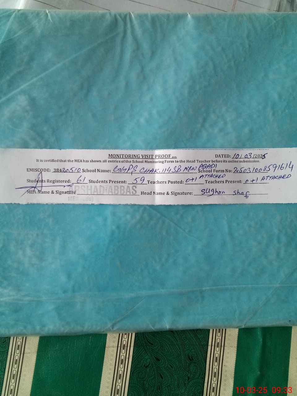 | Certified that this School was Inspected by the Undersigned MEA/DMO Today and the Information Stated Above is as Per Record. | |||||