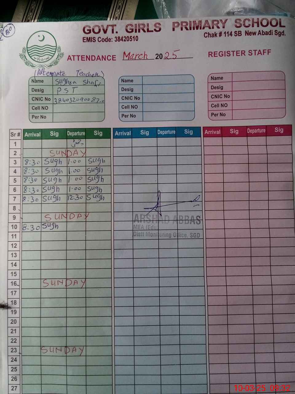 | Name: SU**** AH**** Designation: (School Headmaster's/Headmistress's) PST Phone/Cell Number: 03**** |