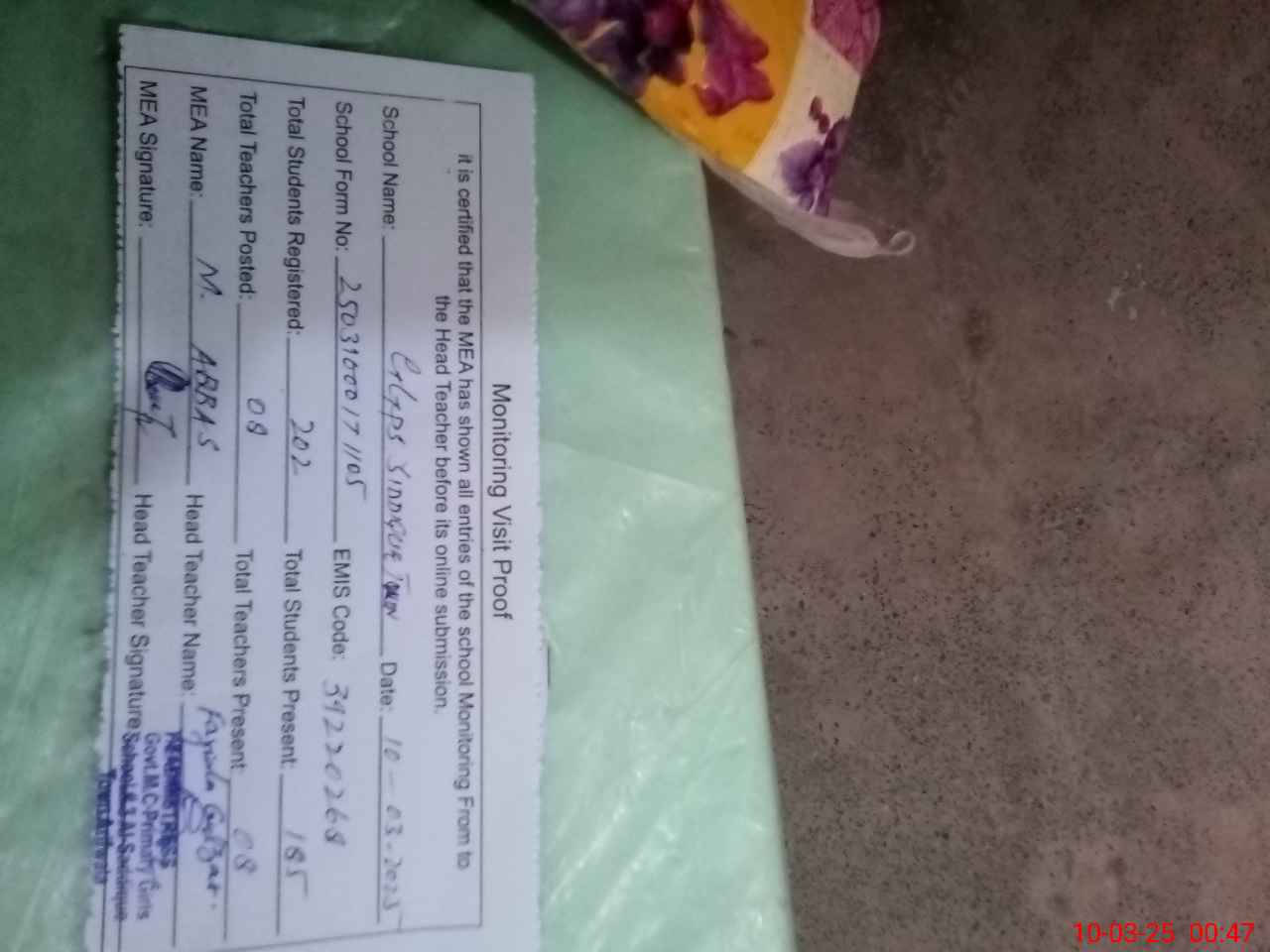 | Certified that this School was Inspected by the Undersigned MEA/DMO Today and the Information Stated Above is as Per Record. | |||||