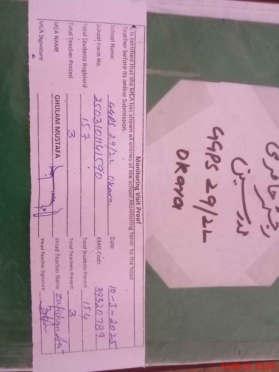 | Certified that this School was Inspected by the Undersigned MEA/DMO Today and the Information Stated Above is as Per Record. | |||||