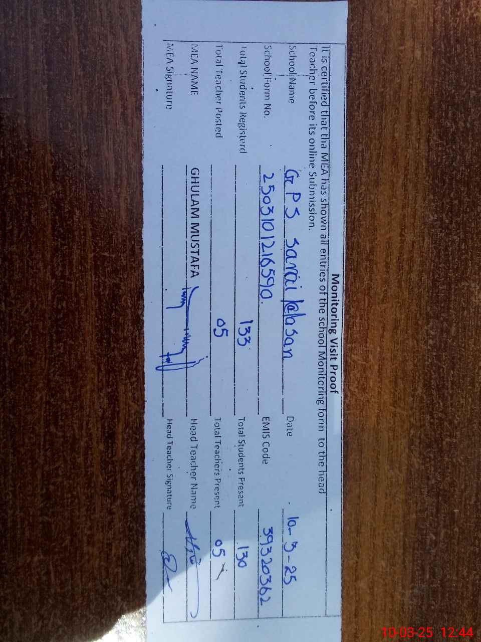 | Certified that this School was Inspected by the Undersigned MEA/DMO Today and the Information Stated Above is as Per Record. | |||||