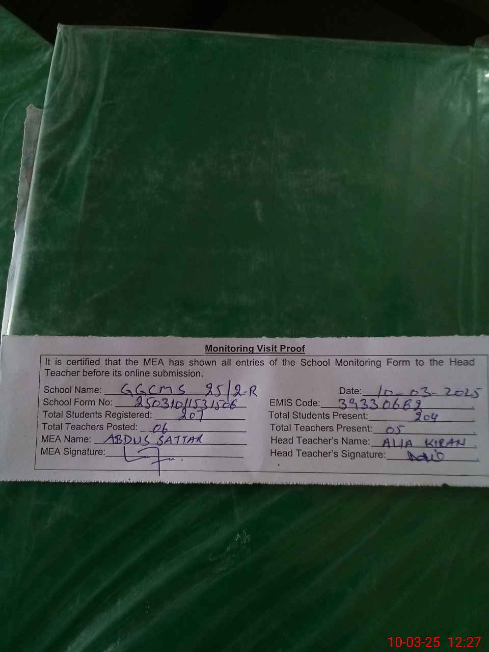 | Attendance Register | Head Teacher | MEA with School | Visit Proof |