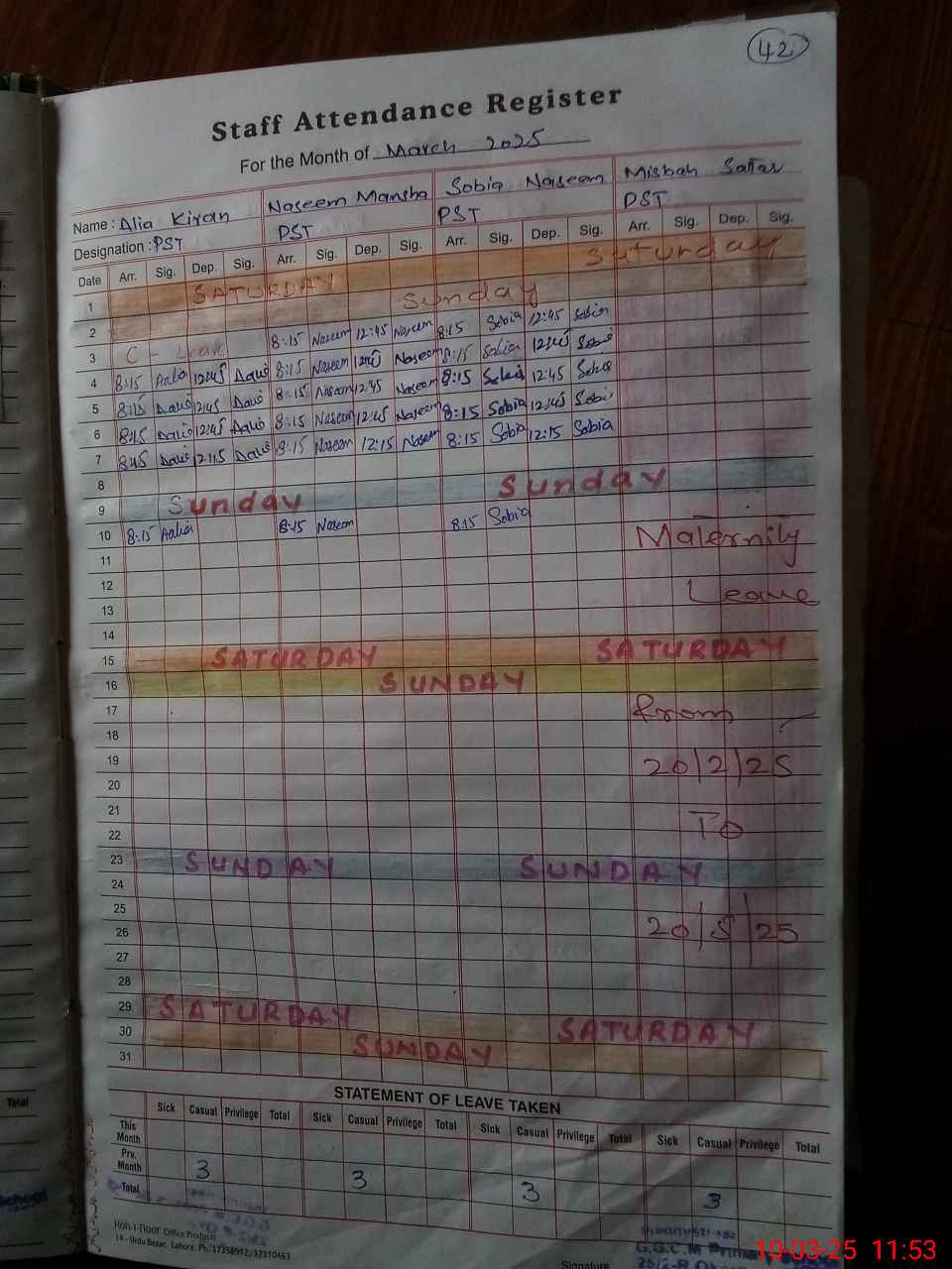 | Leave | Duty | Absent | Maternity | Medical | Ex- Pak |