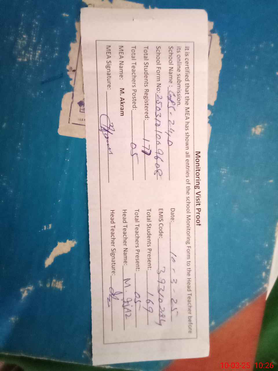 | Monitoring Date: 10-03-2025 | Start Time: 10-03-2025 10:09 AM | End Time: 10-03-2025 10:28 AM | Name of MEA: MU**** AK**** (R**** | |