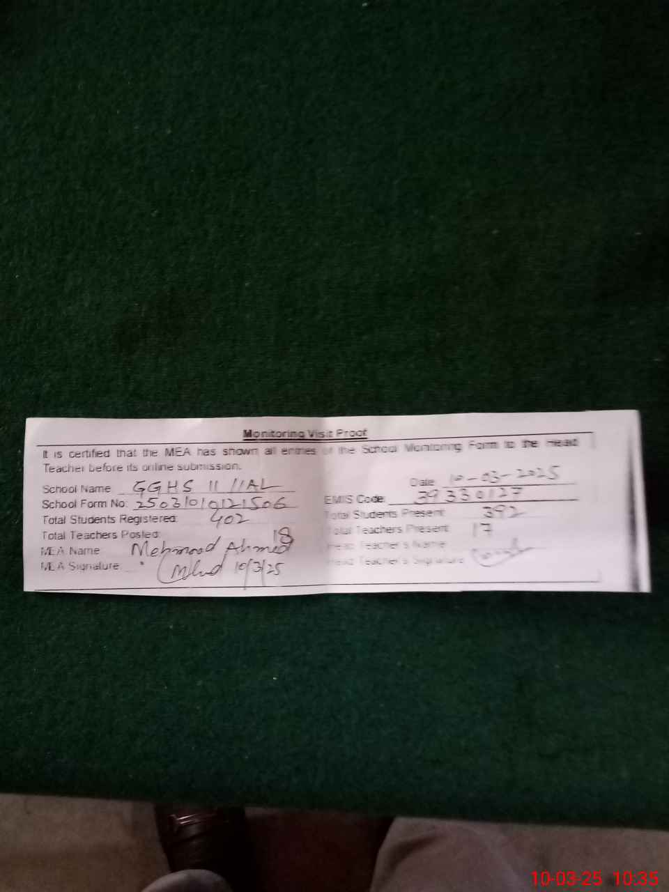 | Certified that this School was Inspected by the Undersigned MEA/DMO Today and the Information Stated Above is as Per Record. | |||||
