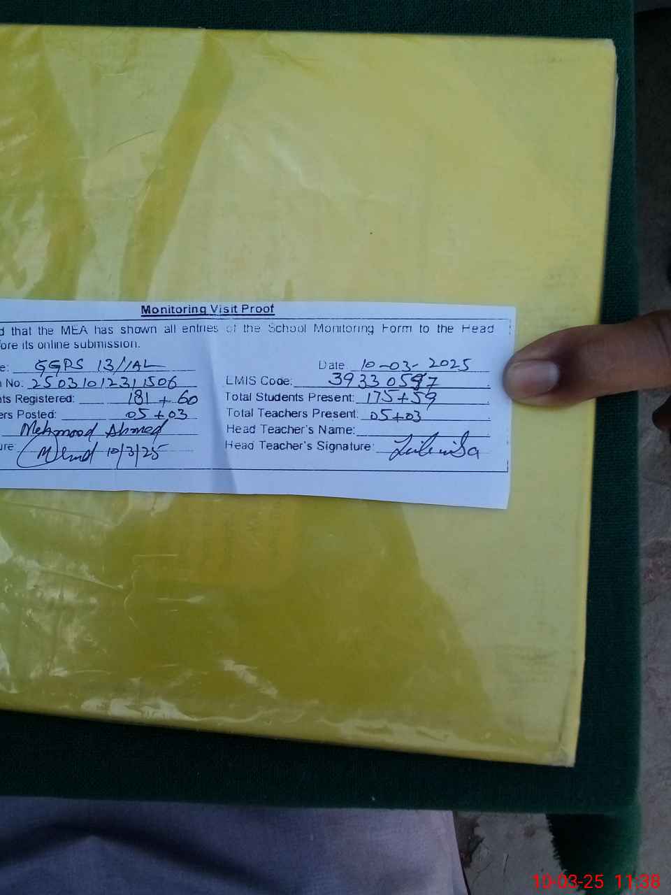 | Attendance Register | Head Teacher | MEA with School | Visit Proof |