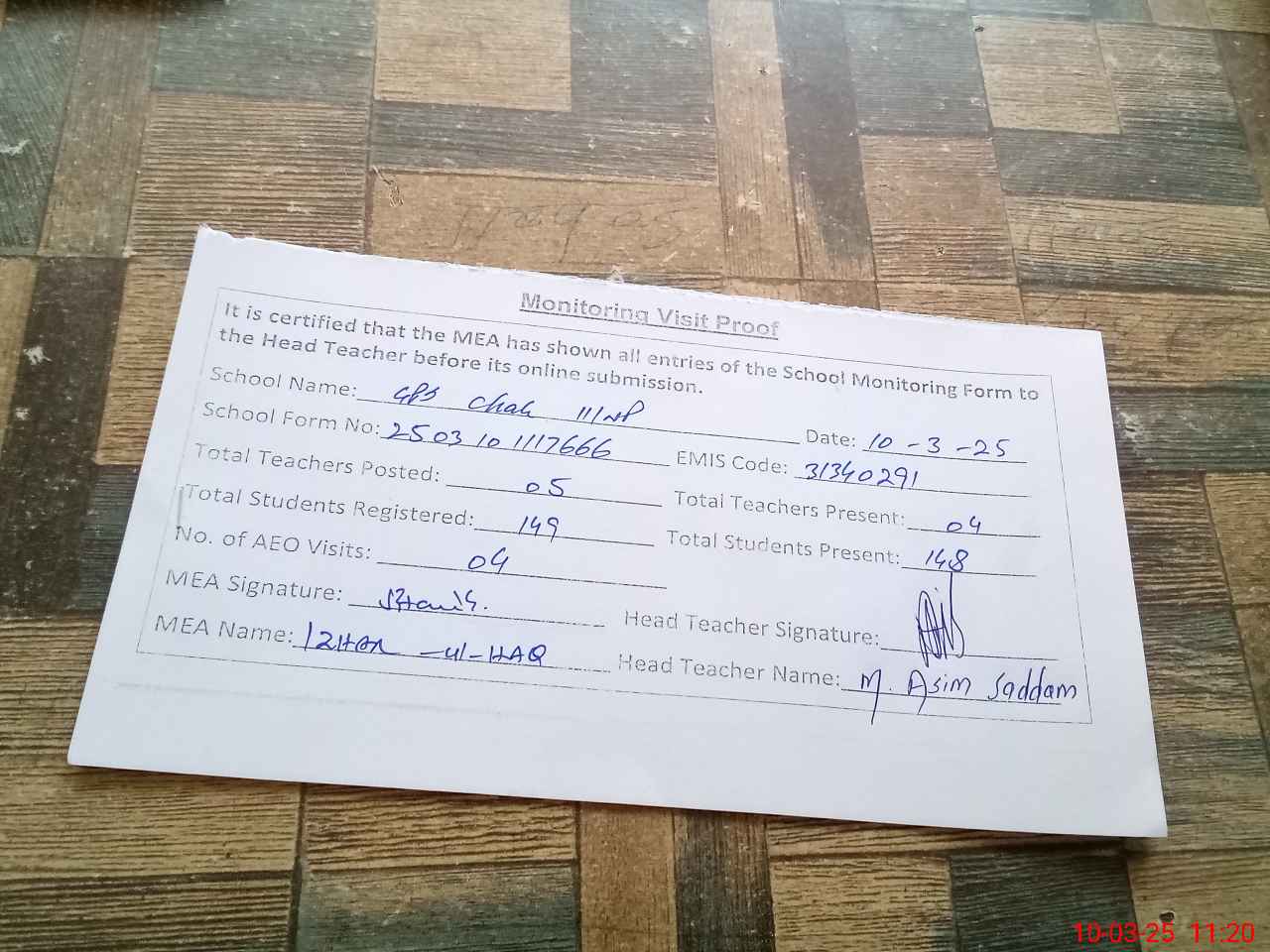 | Attendance Register | Head Teacher | MEA with School | Visit Proof |