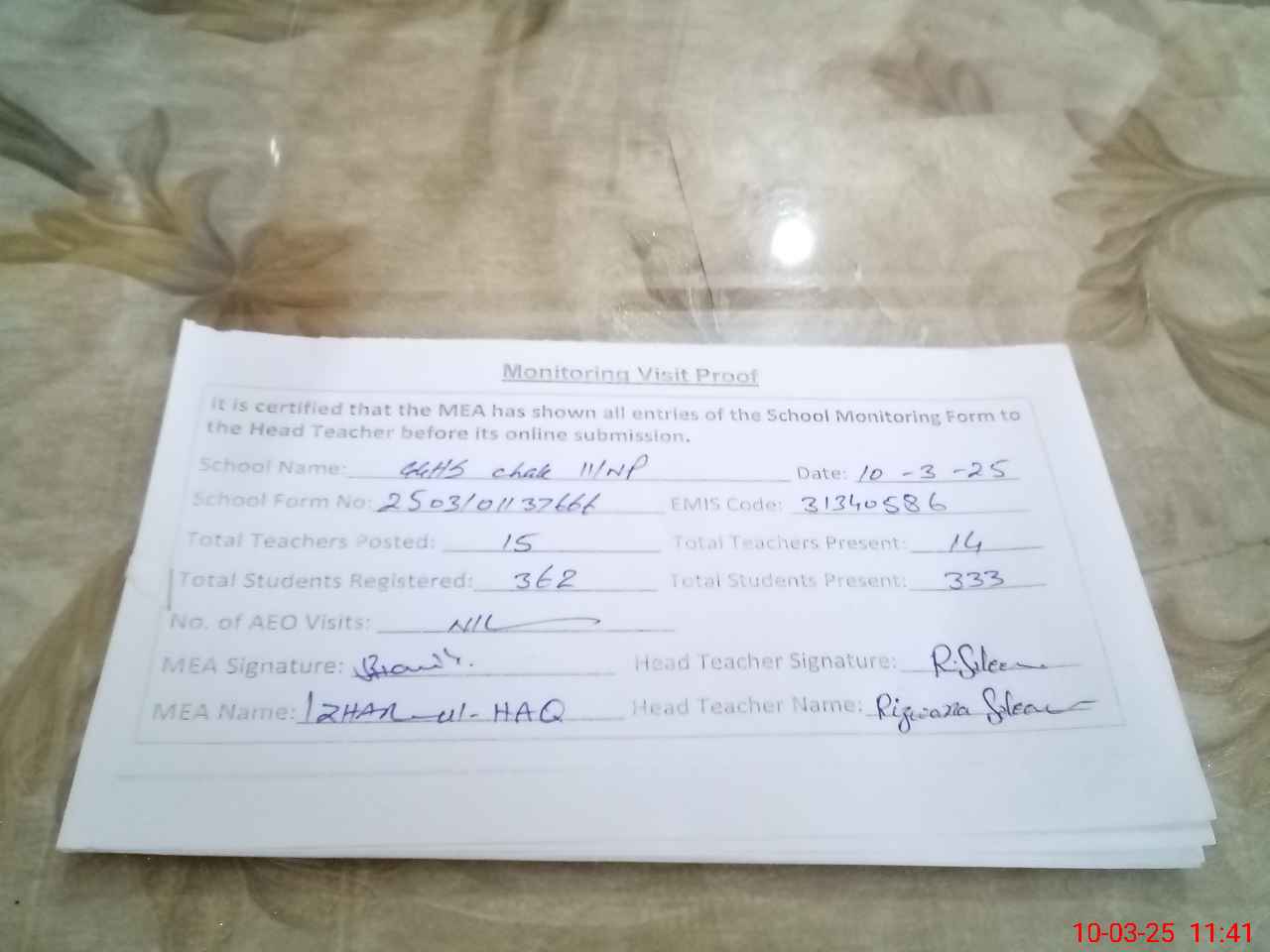 | EMIS Code: 31340586 | Name of School: GGHS CHAK NO. 11/NP | |||