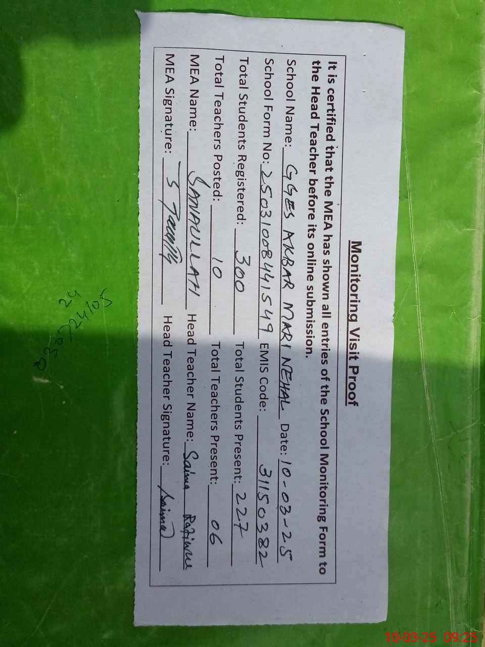 | Attendance Register | Head Teacher | MEA with School | Visit Proof |