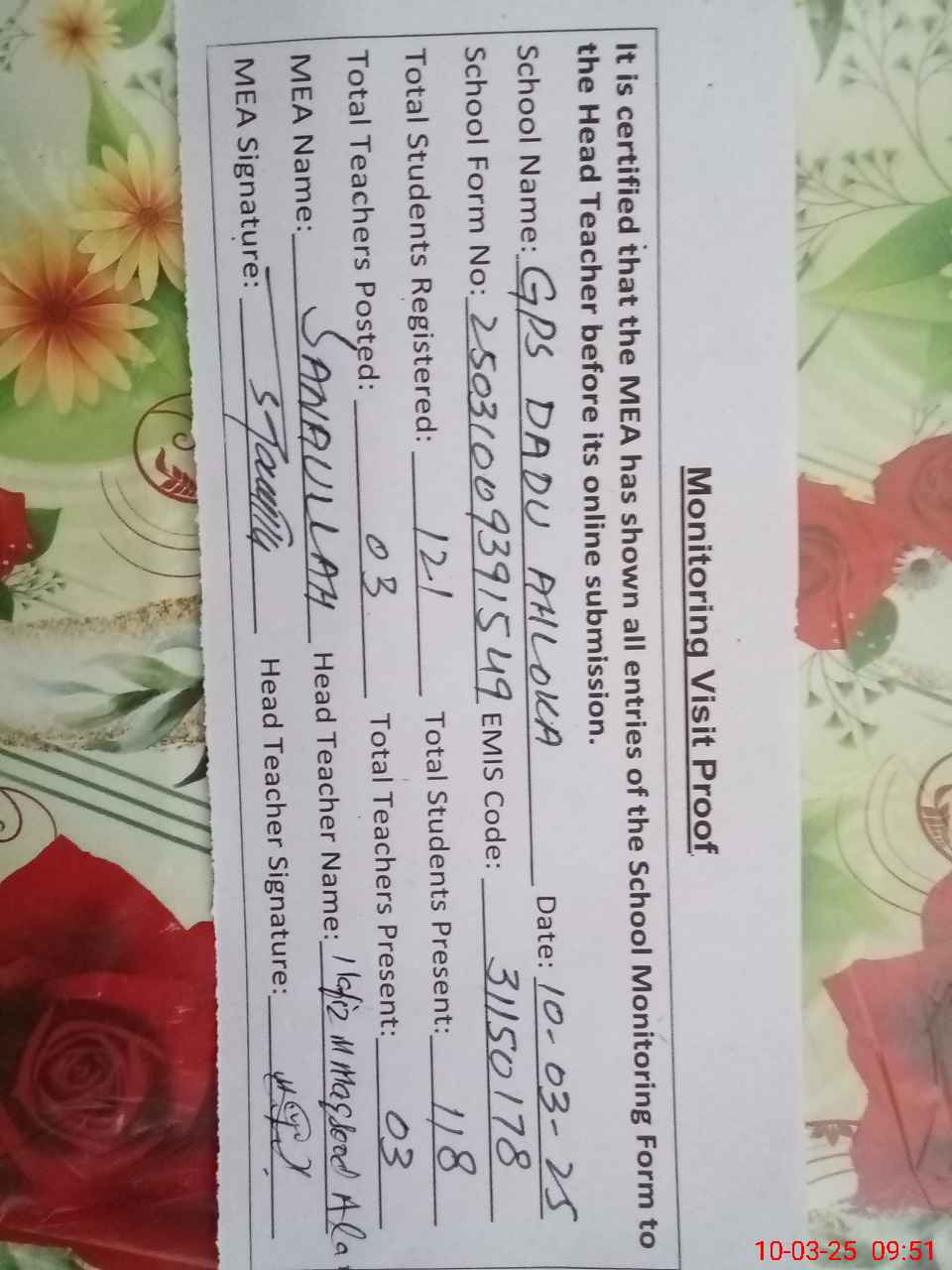 | Certified that this School was Inspected by the Undersigned MEA/DMO Today and the Information Stated Above is as Per Record. | |||||
