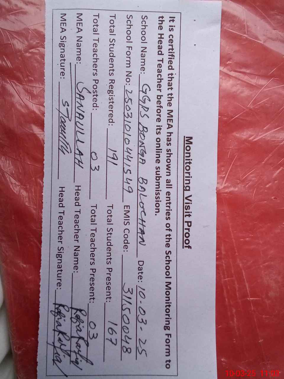 | Attendance Register | Head Teacher | MEA with School | Visit Proof |