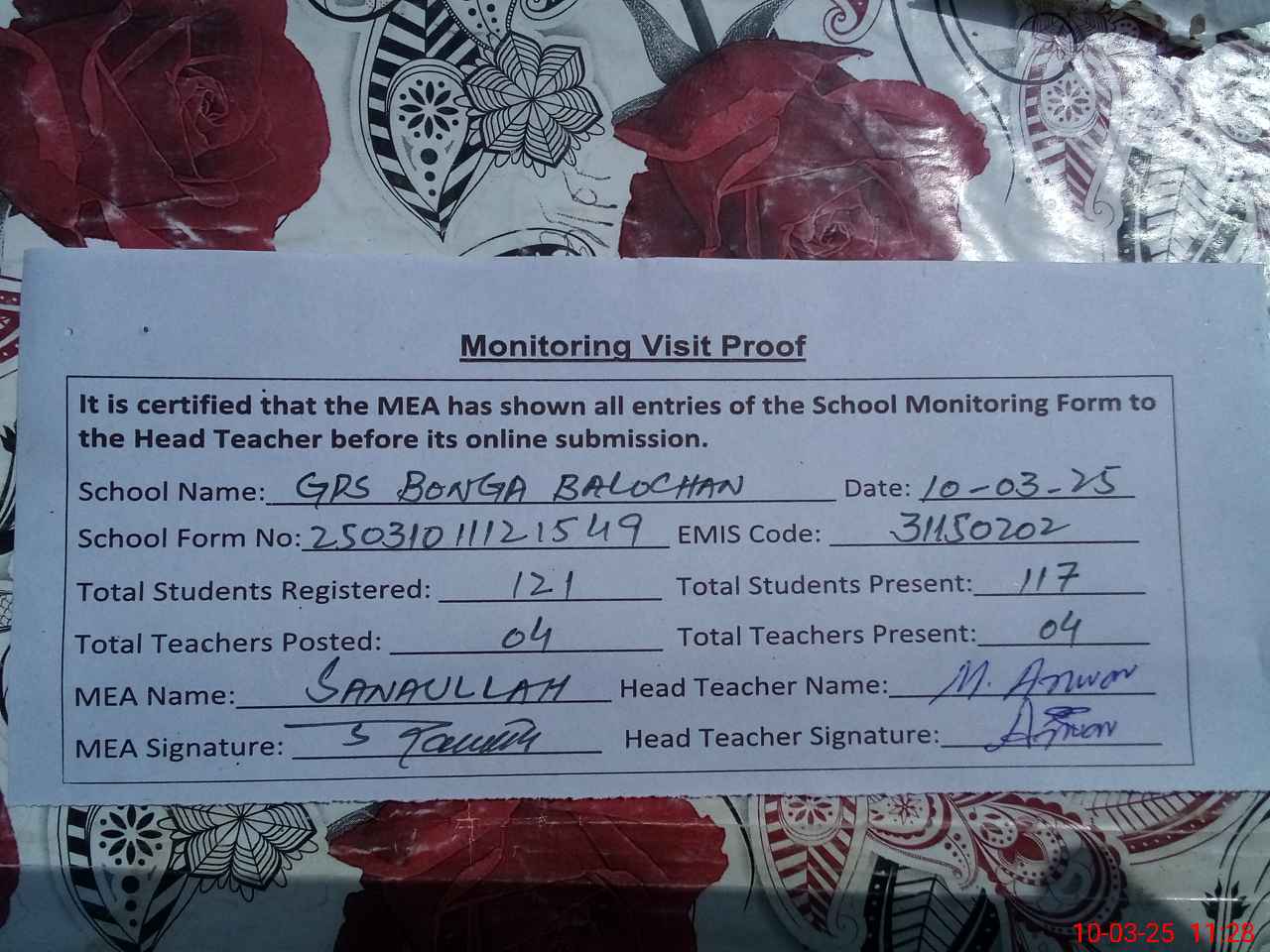 | EMIS Code: 31150202 | Name of School: GPS BONGA BALOCHAN | |||