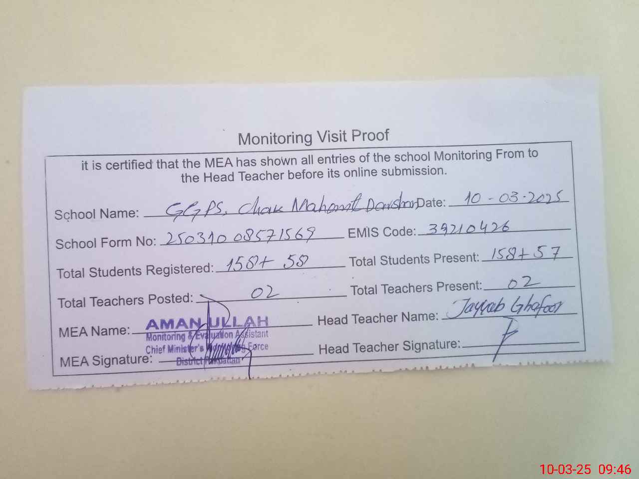 | EMIS Code: 39210426 | Name of School: GGPS CHAK MEHNAT DURSHAN | |||