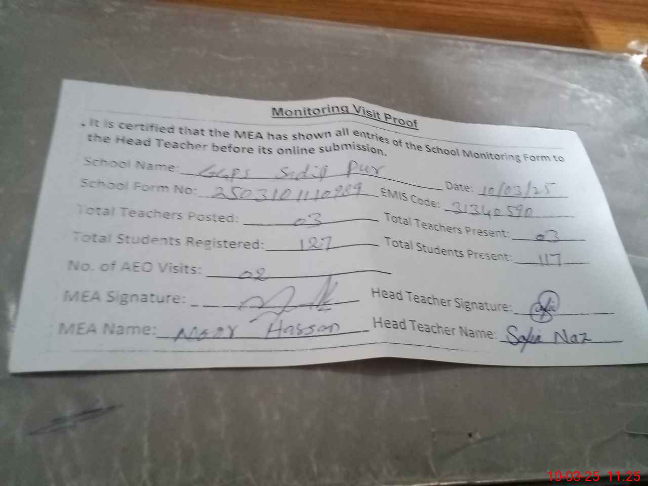 | Attendance Register | Head Teacher | MEA with School | Visit Proof |