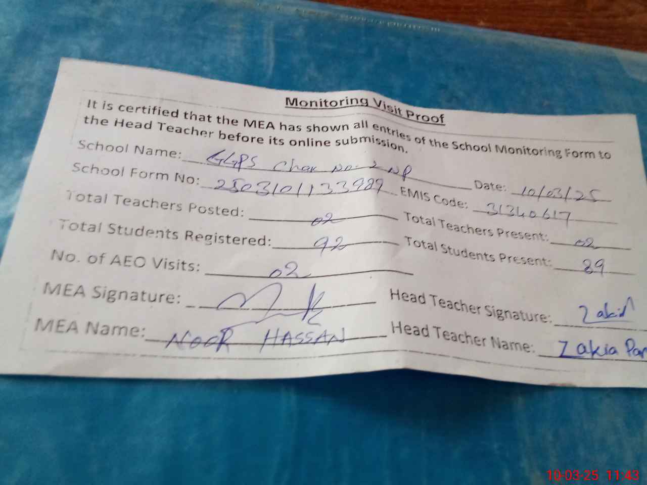 | Attendance Register | Head Teacher | MEA with School | Visit Proof |
