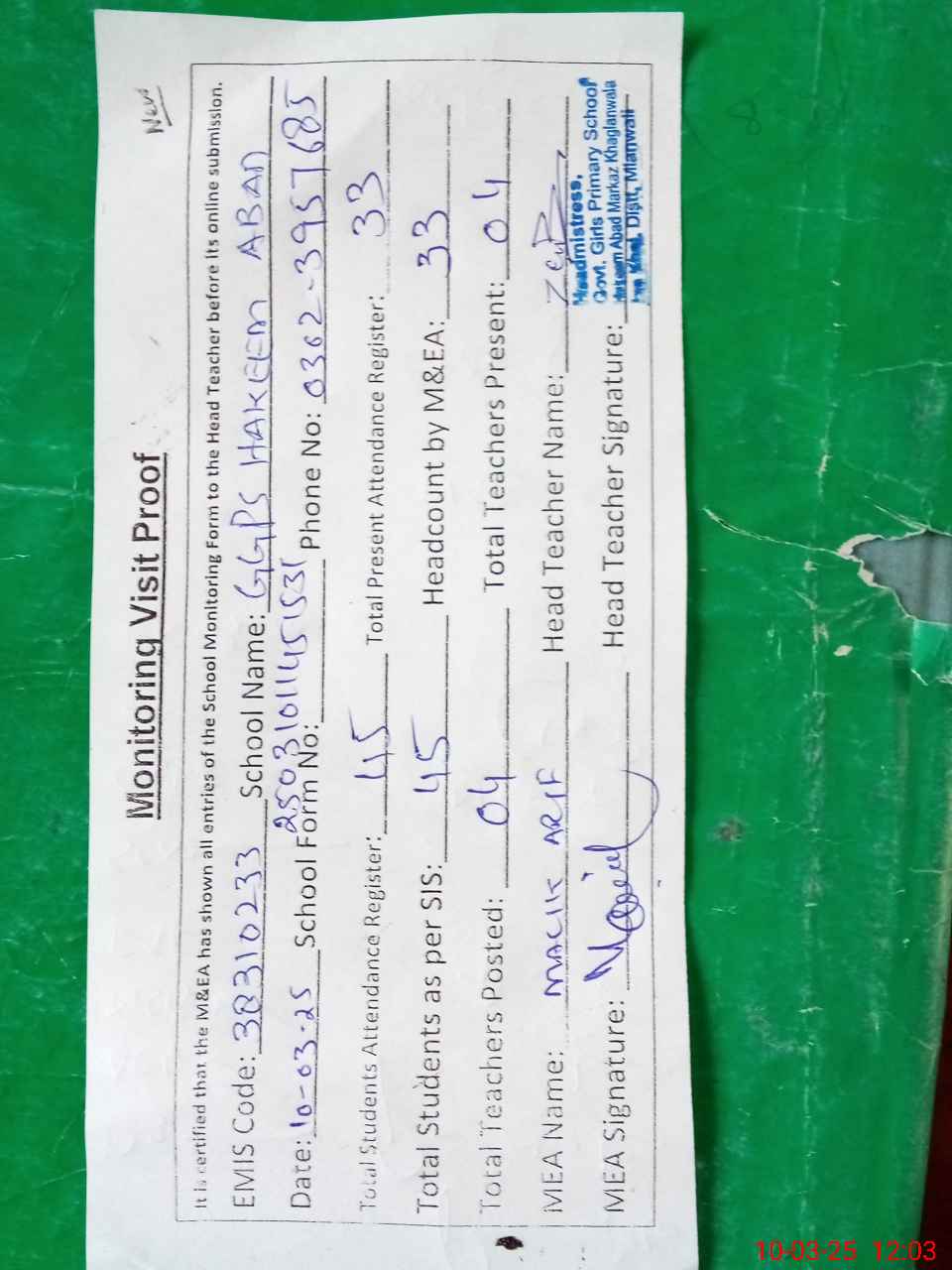 | Attendance Register | Head Teacher | MEA with School | Visit Proof |