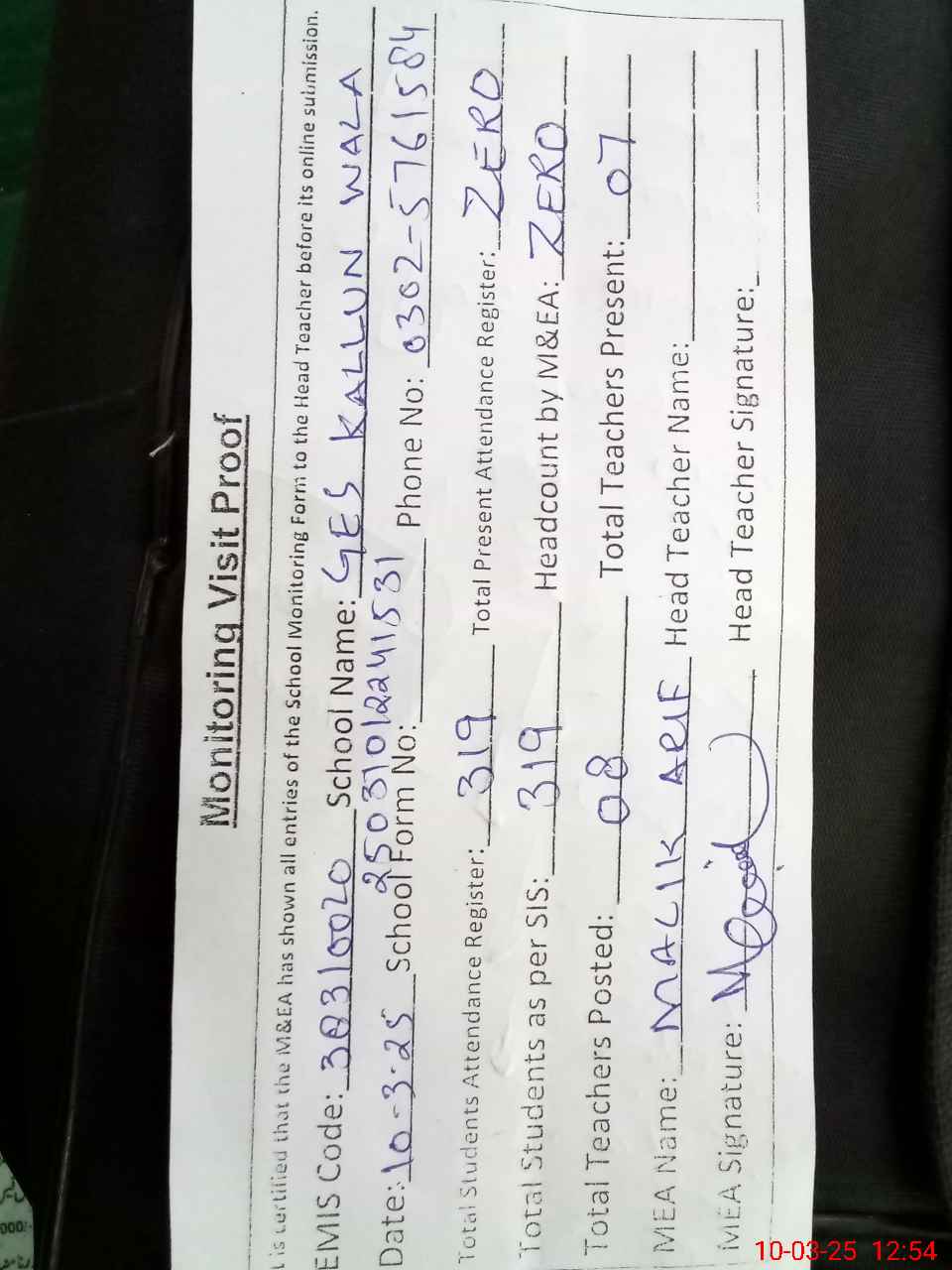 | Remarks (Use Separate Page if Required): Teacher Mr Riaz PST marked as absent as no order of exam duty shown Students attendance zero as no students were physically present Head Teacher refused to signed the visit proof as students attendance zero | |||||