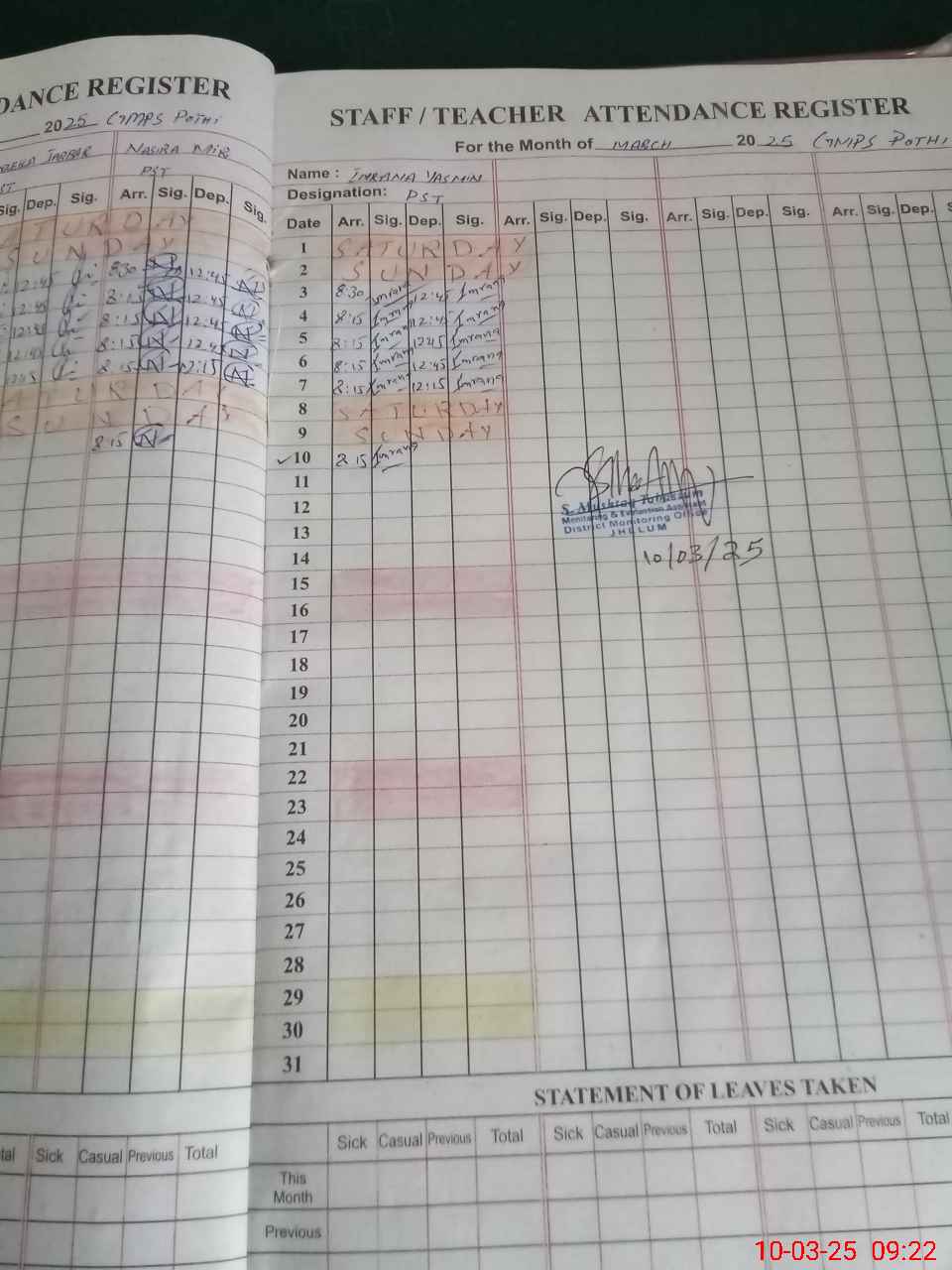 | Monitoring Date: 10-03-2025 | Start Time: 10-03-2025 09:01 AM | End Time: 10-03-2025 09:29 AM | Name of MEA: Sh**** Mu**** Ta**** | |