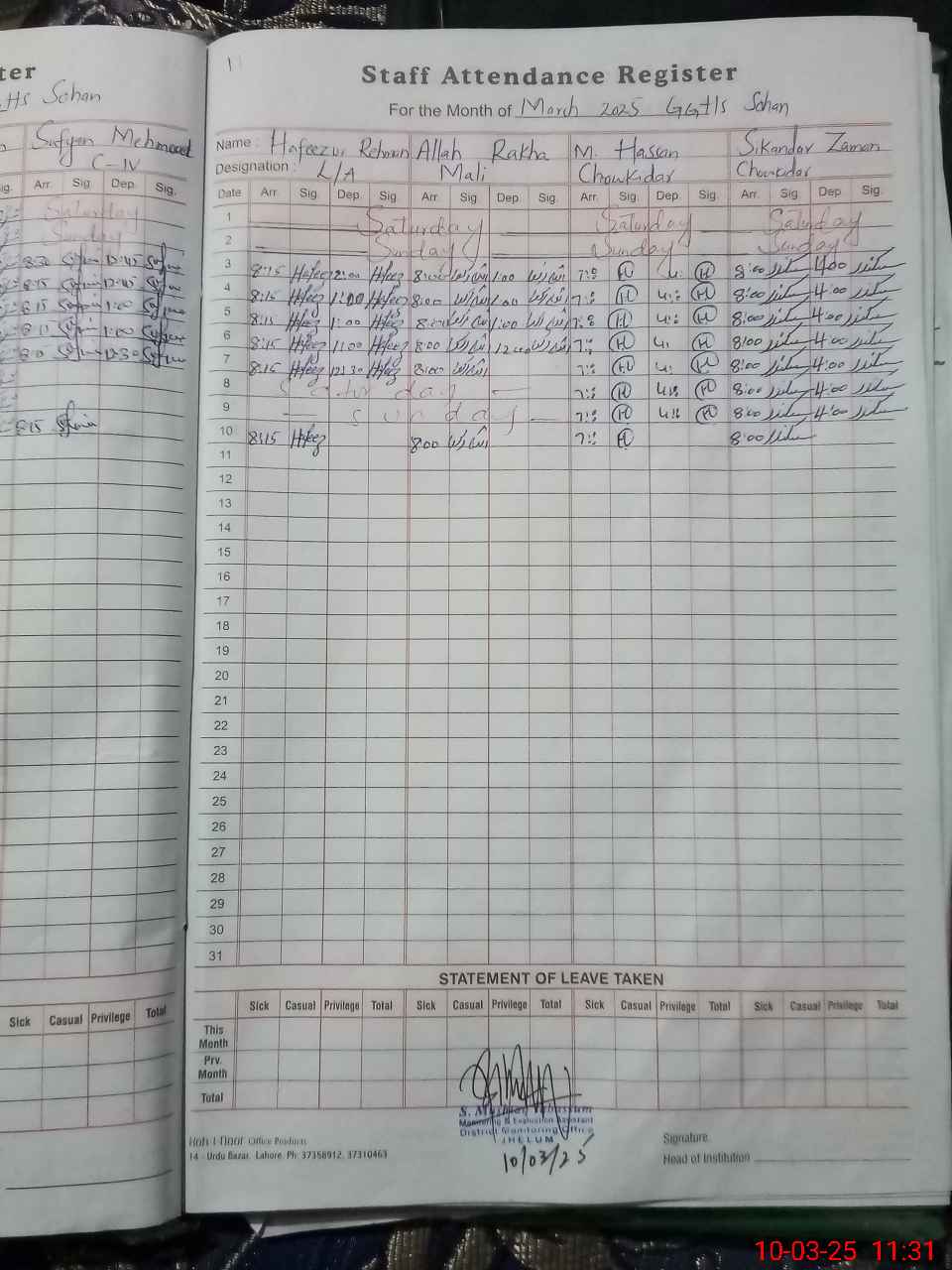 | CNIC | Full Name | Designation | R/C | Absence During Last Calender Month |