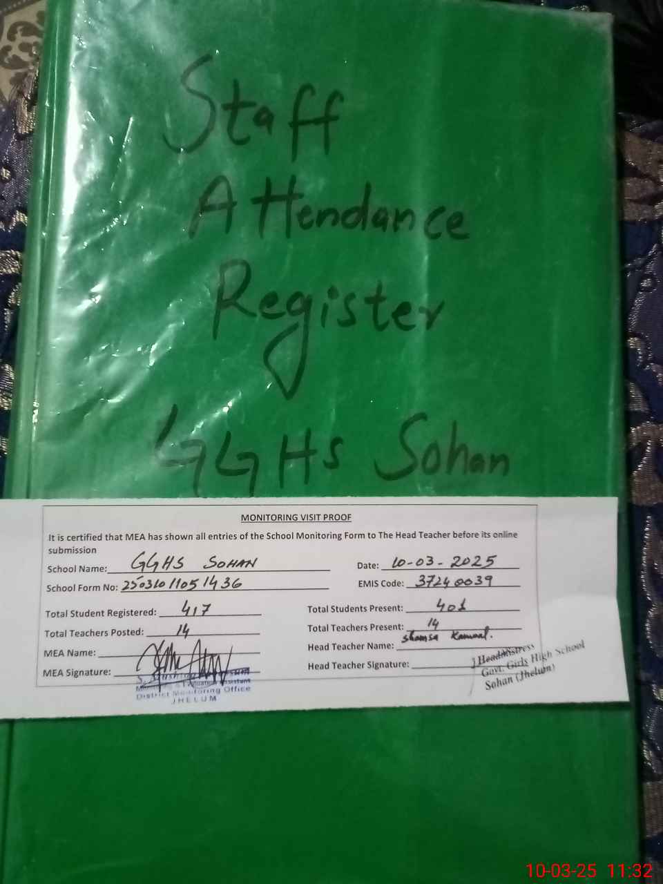 | Attendance Register | Head Teacher | MEA with School | Visit Proof |