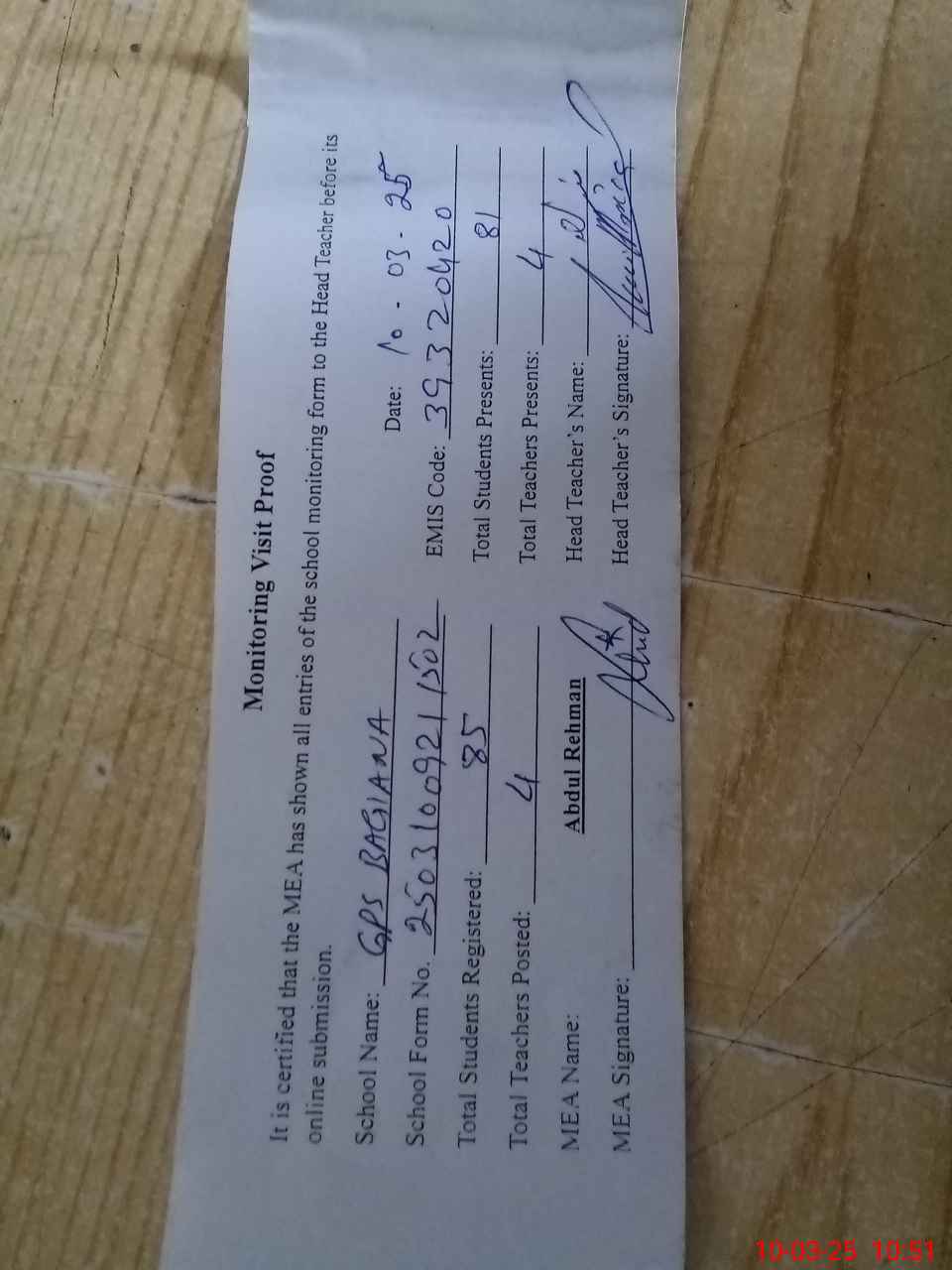 | Attendance Register | Head Teacher | MEA with School | Visit Proof |