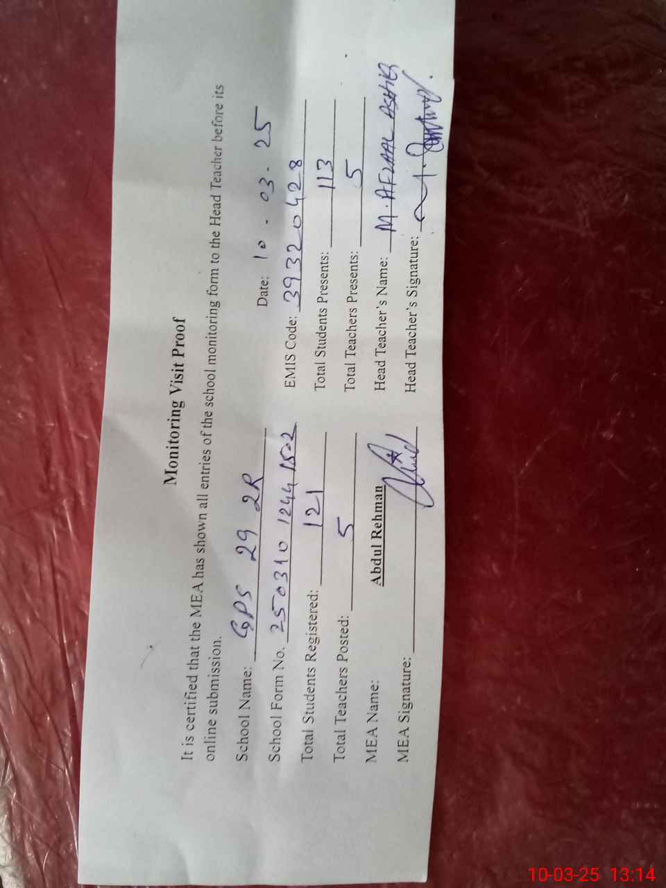 | Attendance Register | Head Teacher | MEA with School | Visit Proof |