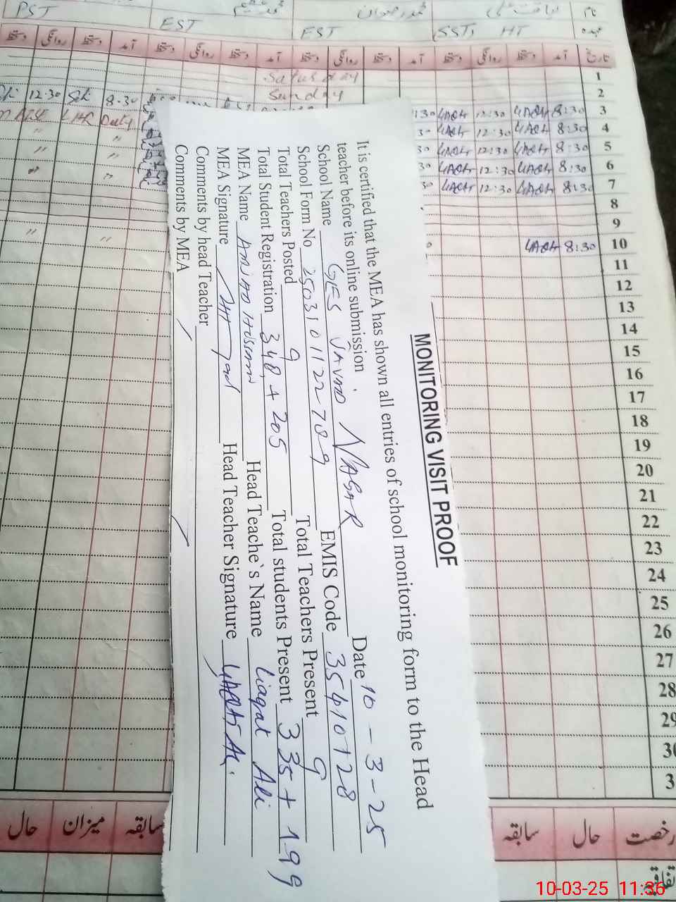 | Attendance Register | Head Teacher | MEA with School | Visit Proof |
