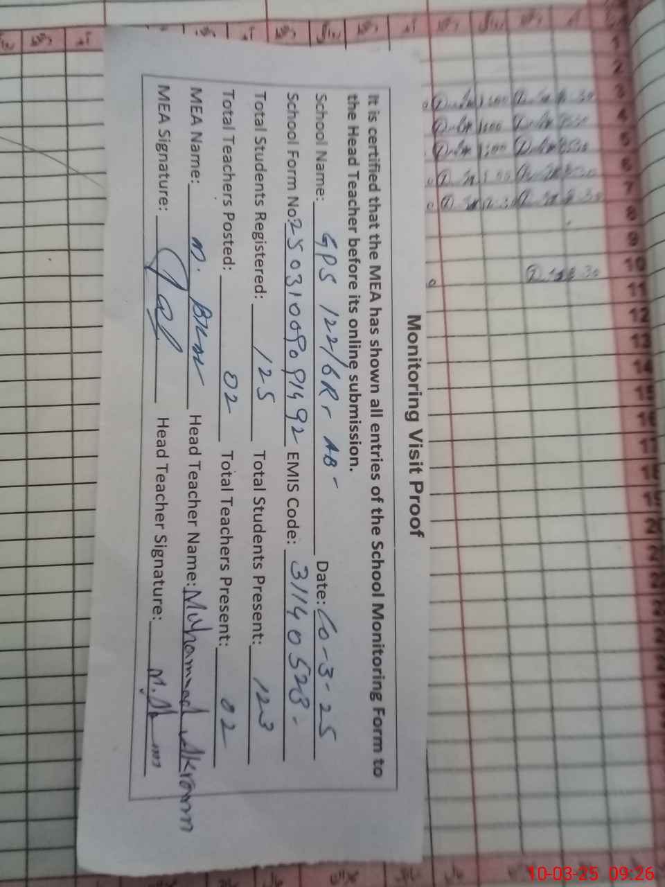 | EMIS Code: 31140523 | Name of School: GPS CHAK NO.122/6-R | |||