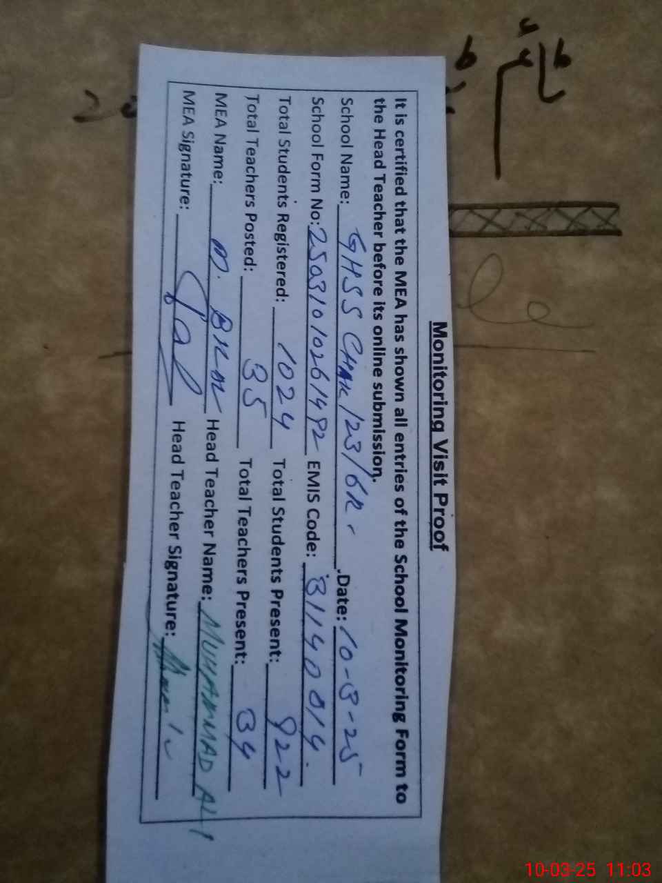 | Attendance Register | Head Teacher | MEA with School | Visit Proof |