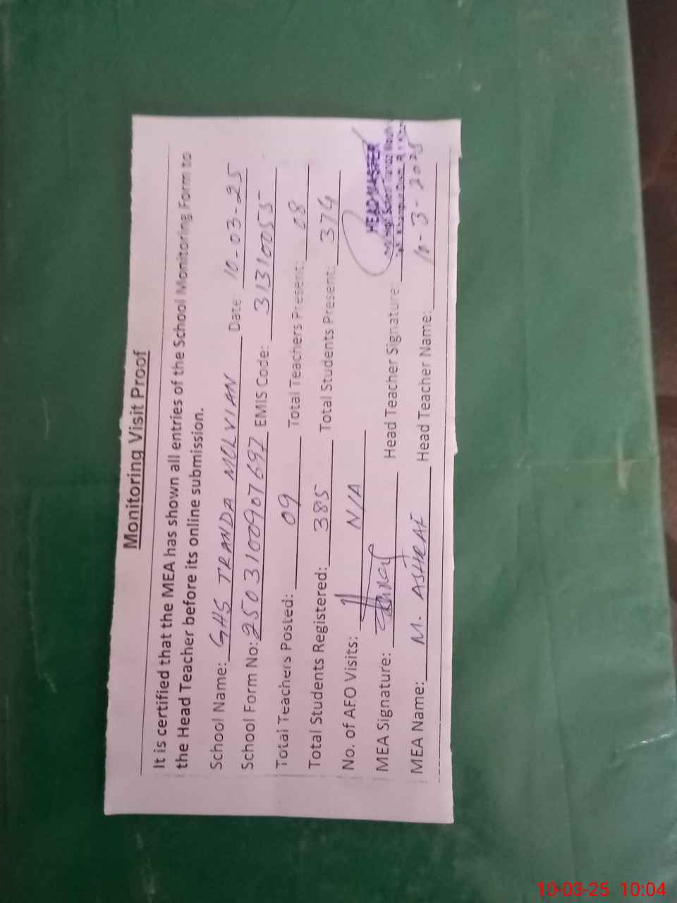 | Attendance Register | Head Teacher | MEA with School | Visit Proof |