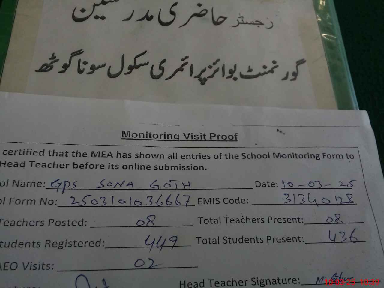 | Attendance Register | Head Teacher | MEA with School | Visit Proof |