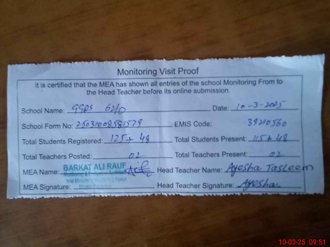 | Monitoring Date: 10-03-2025 | Start Time: 10-03-2025 08:58 AM | End Time: 10-03-2025 09:53 AM | Name of MEA: BA**** AL**** RA**** | |
