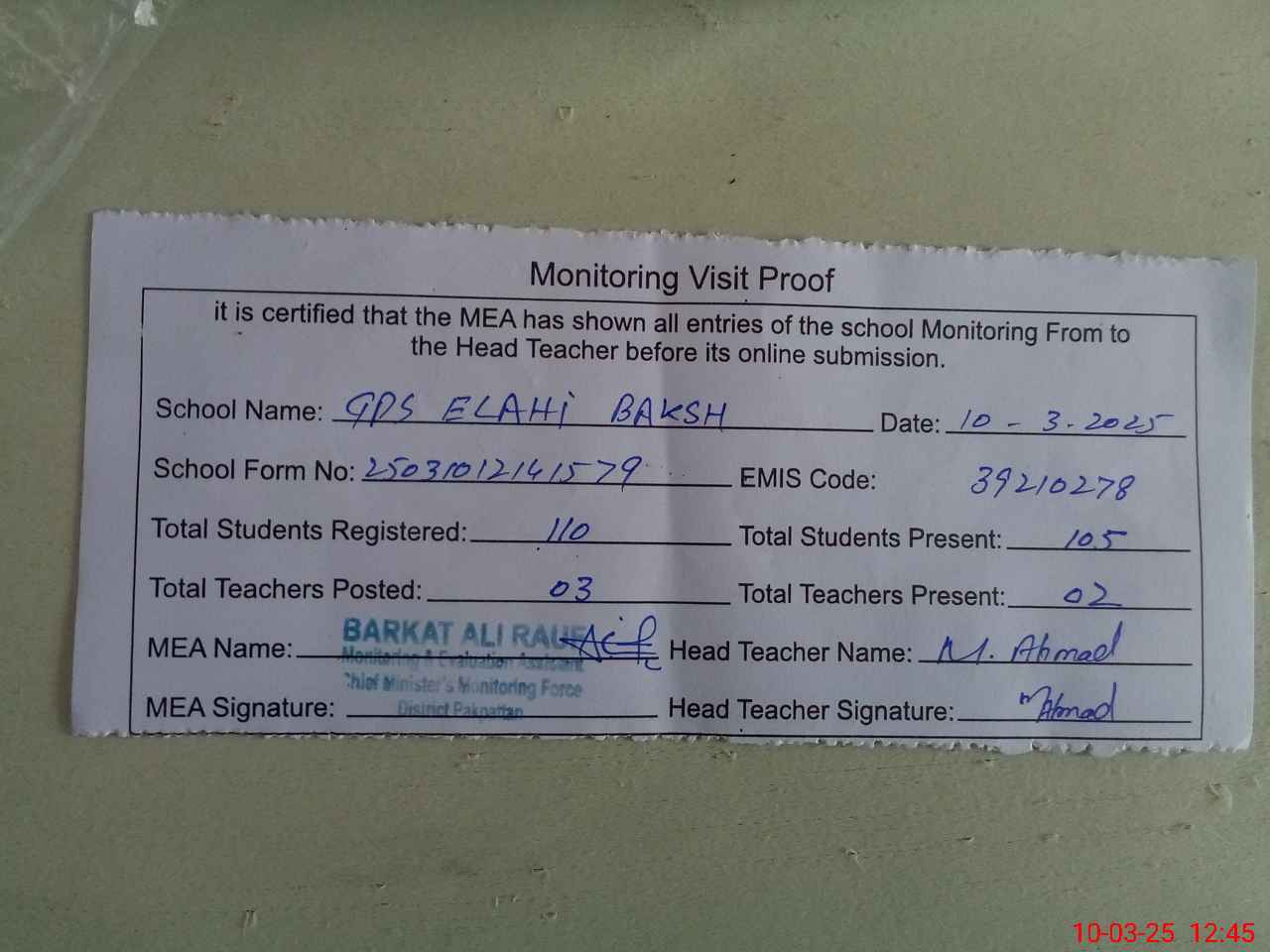 | Attendance Register | Head Teacher | MEA with School | Visit Proof |