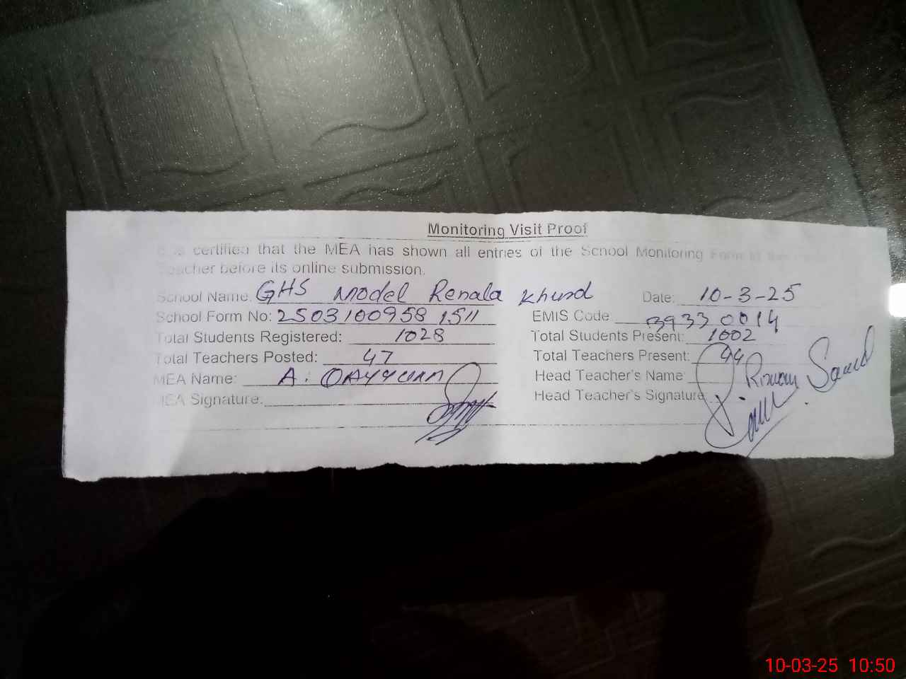 | Monitoring Date: 10-03-2025 | Start Time: 10-03-2025 09:58 AM | End Time: 10-03-2025 10:50 AM | Name of MEA: AB**** QA**** | |