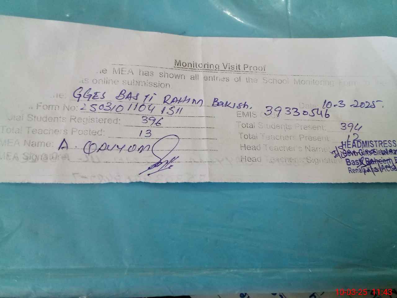 | Attendance Register | Head Teacher | MEA with School | Visit Proof |
