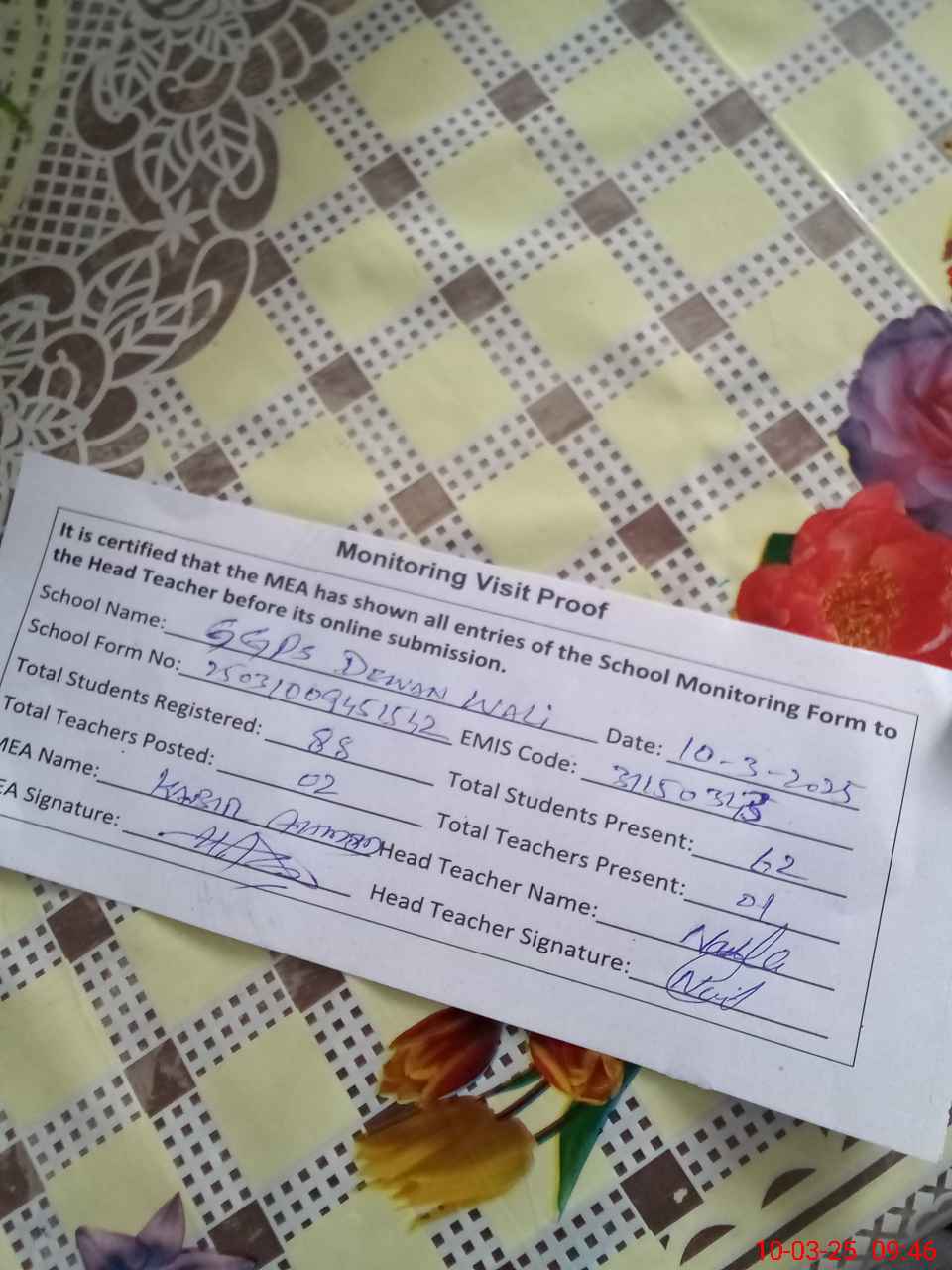 | Certified that this School was Inspected by the Undersigned MEA/DMO Today and the Information Stated Above is as Per Record. | |||||