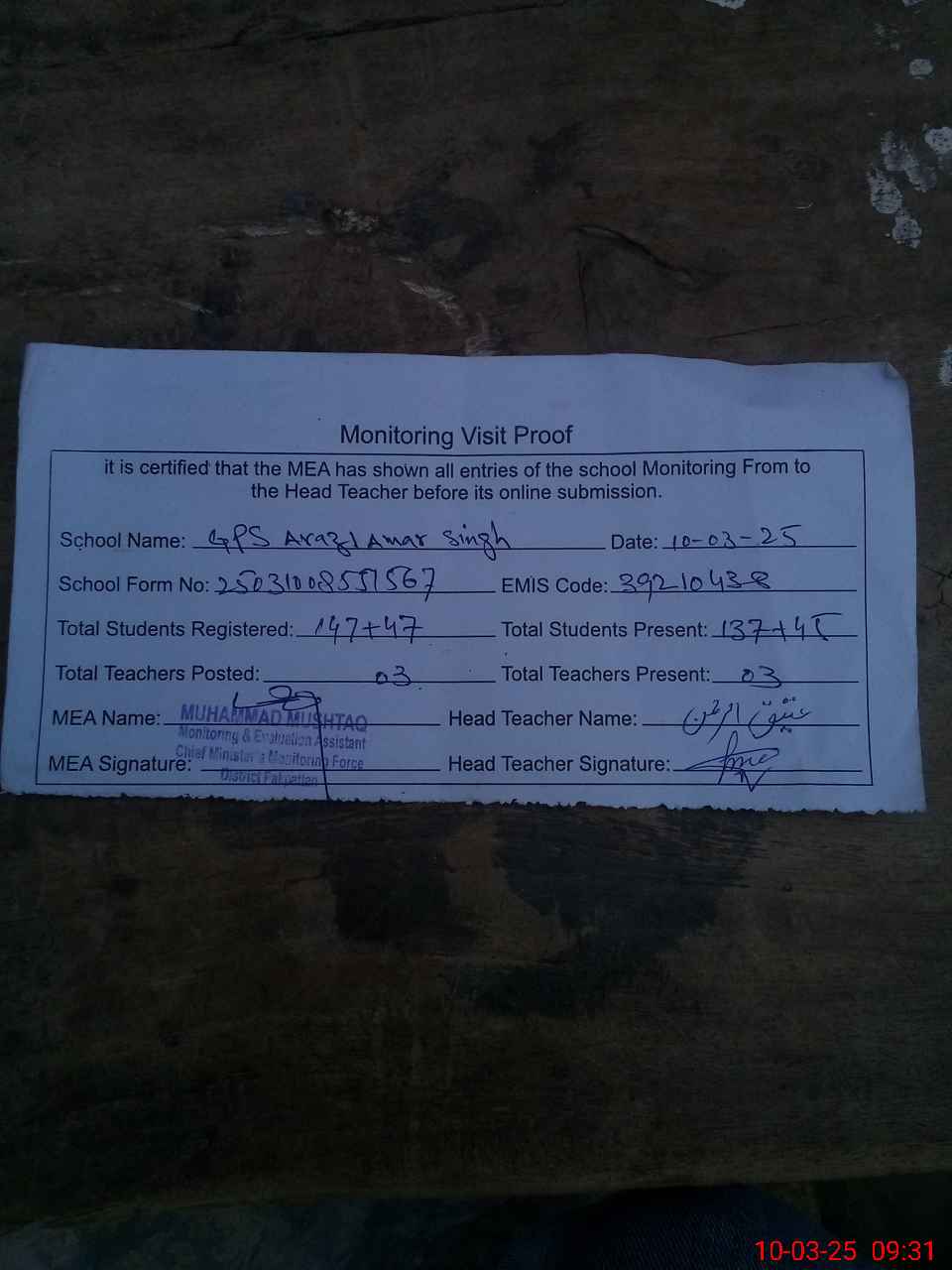 | EMIS Code: 39210438 | Name of School: GPS ARAZI AMAR SINGH | |||