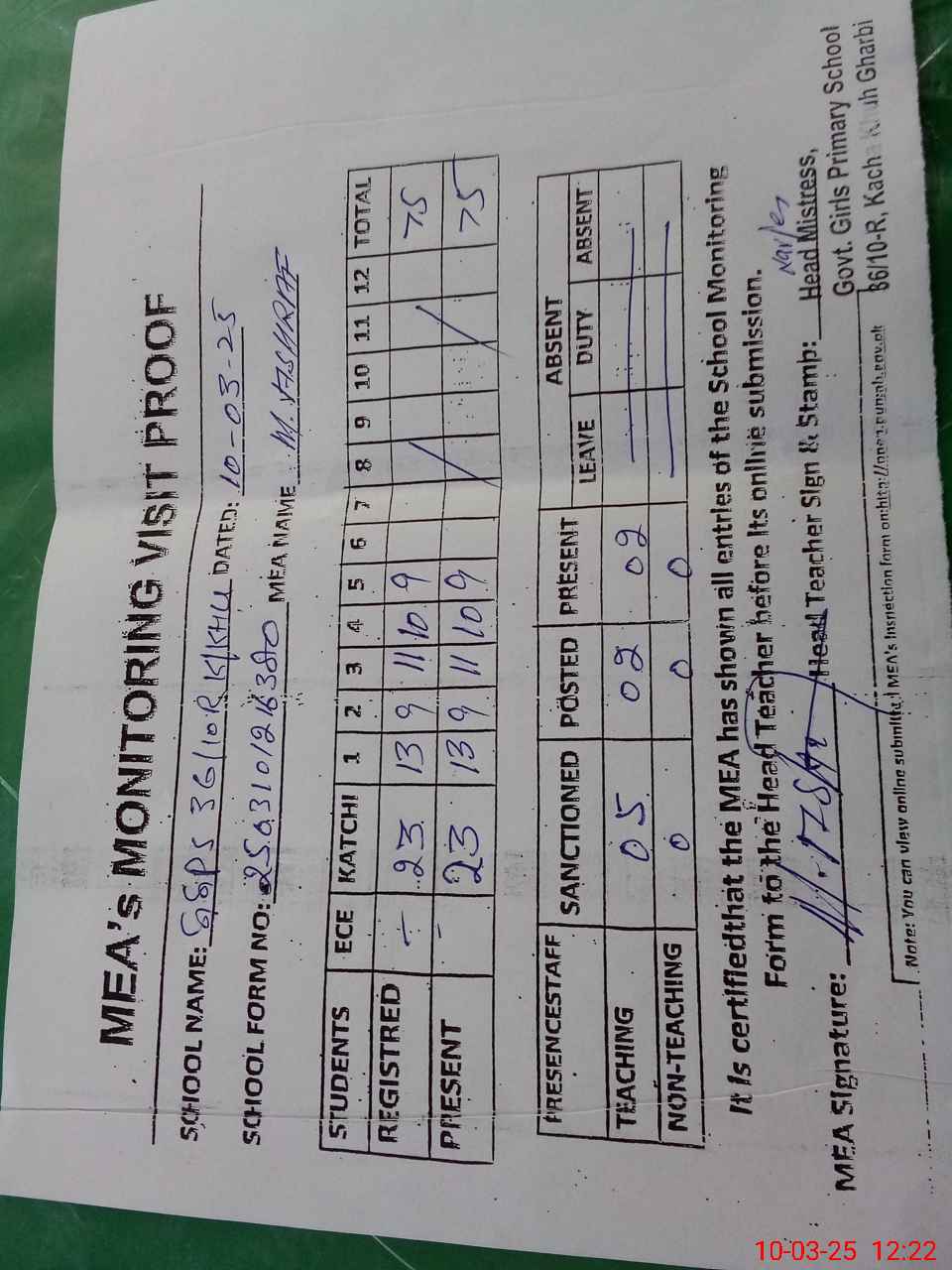 | Attendance Register | Head Teacher | MEA with School | Visit Proof |