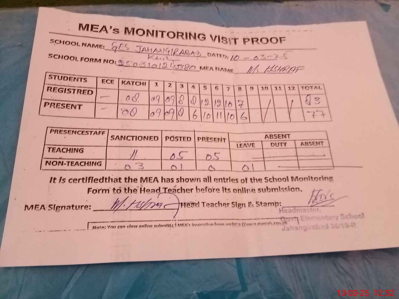 | Attendance Register | Head Teacher | MEA with School | Visit Proof |