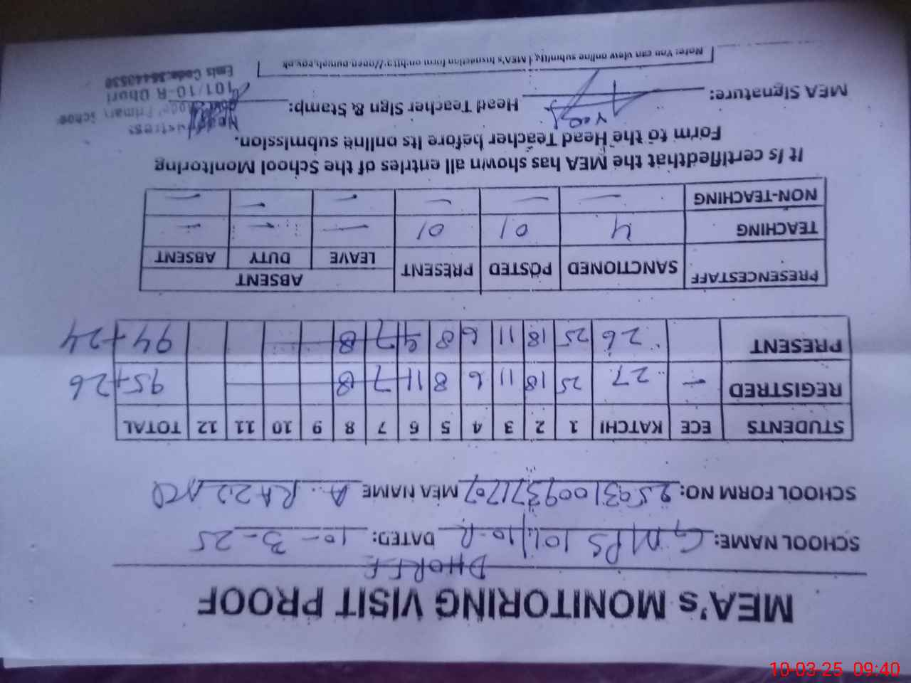 | Attendance Register | Head Teacher | MEA with School | Visit Proof |