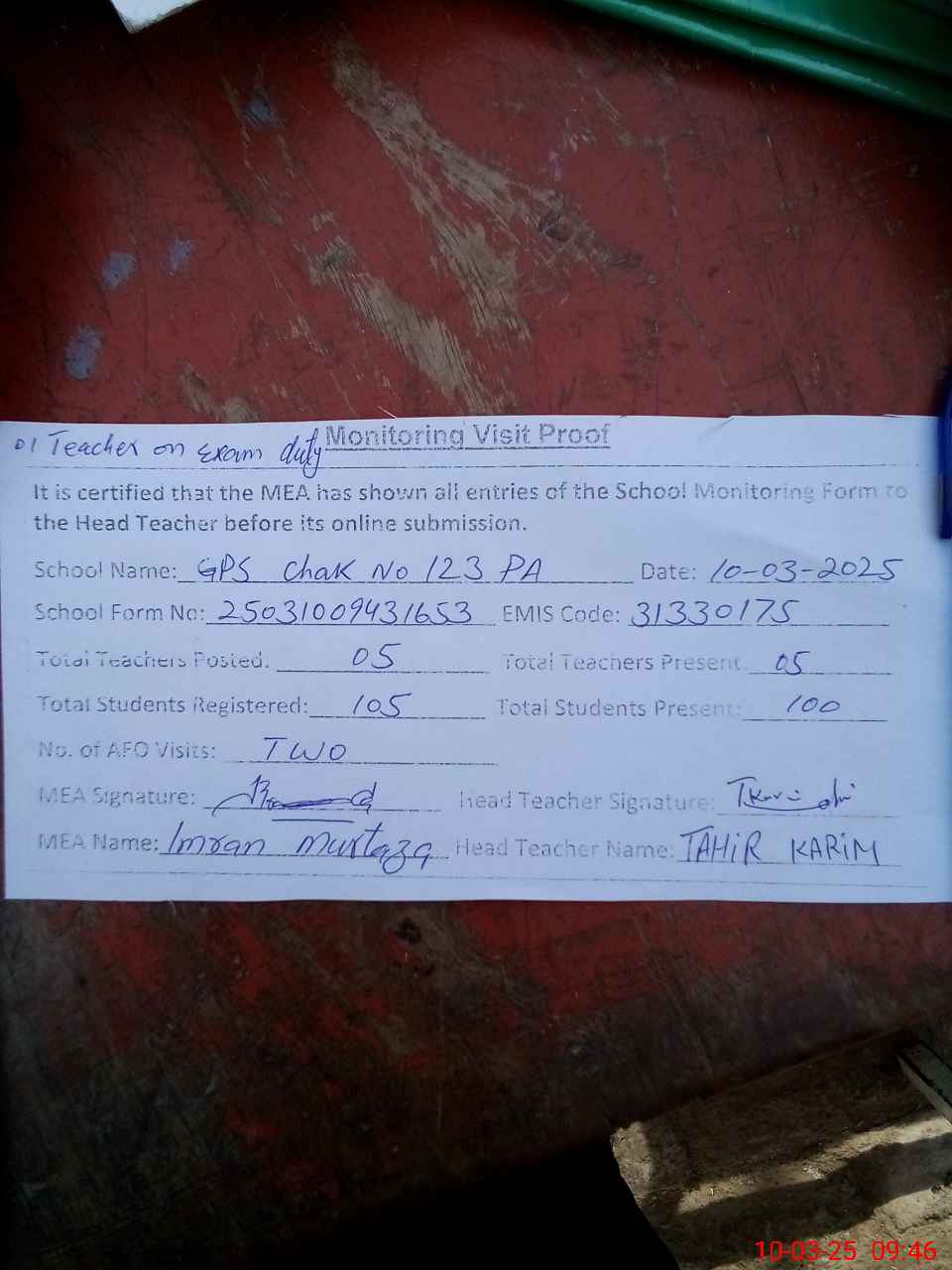 | Attendance Register | Head Teacher | MEA with School | Visit Proof |