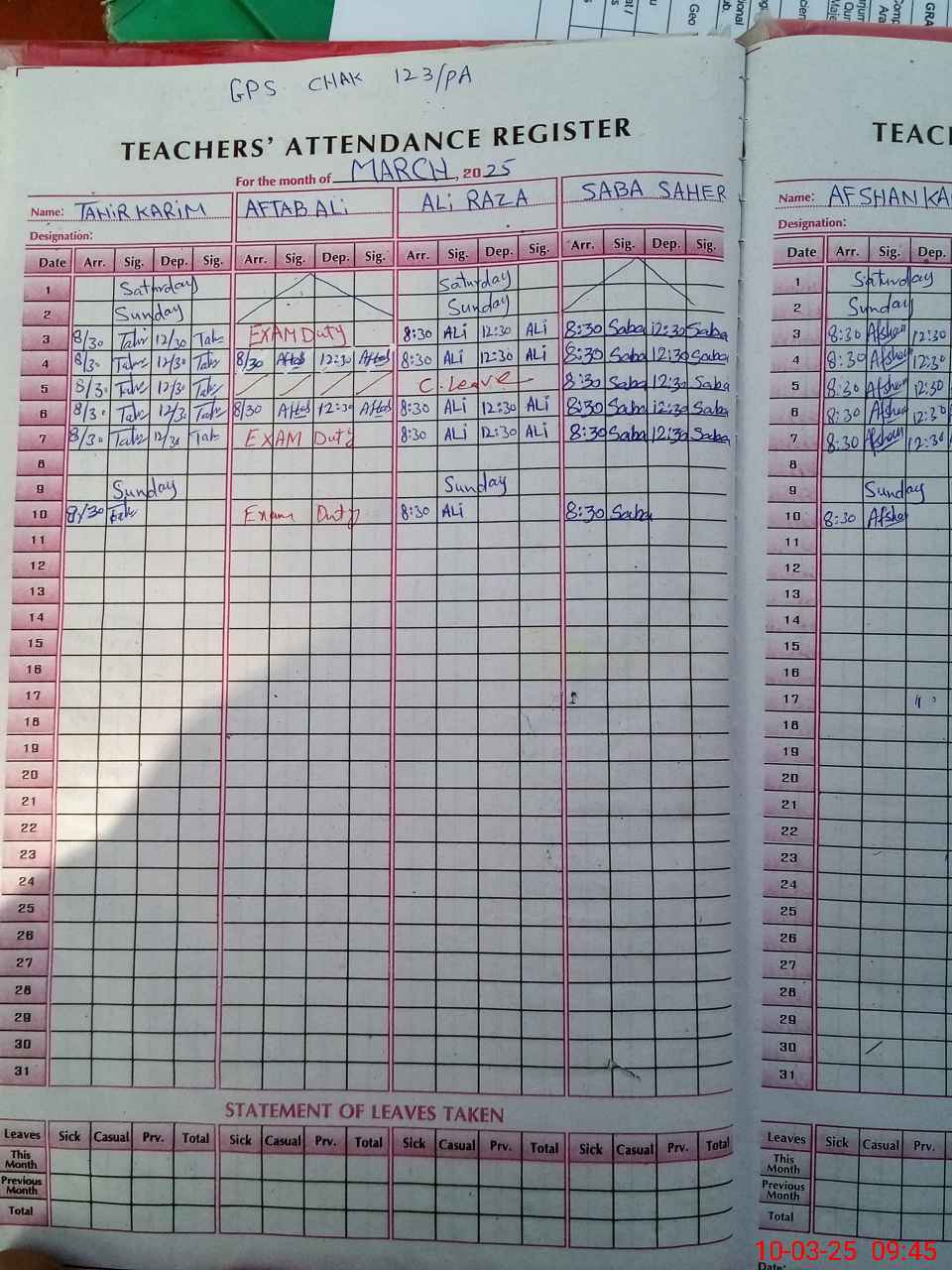 | 31**** | Af**** Al**** | PST | Regular | 2 | 0 | 0 | 0 | 0 | 0 | 0 | 0 | 2 | Exam Duty |