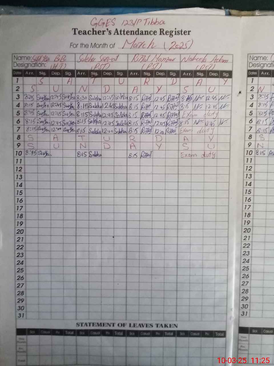 | 31**** | Na**** As**** | 1 | 0 | 5 | 0 | 0 | 0 | 0 | 0 | 0 | 0 | Exam Duty | |