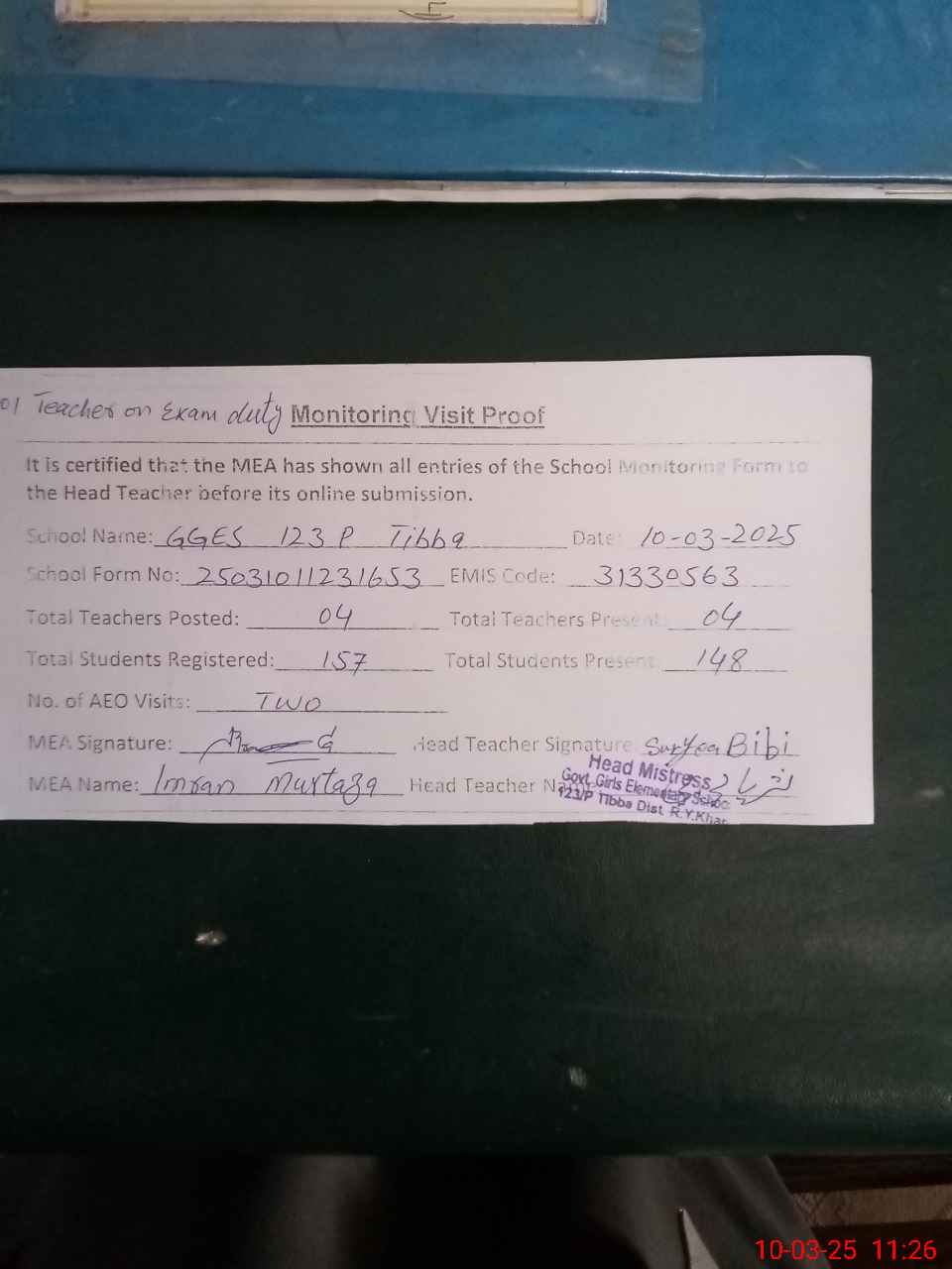 | Attendance Register | Head Teacher | MEA with School | Visit Proof |