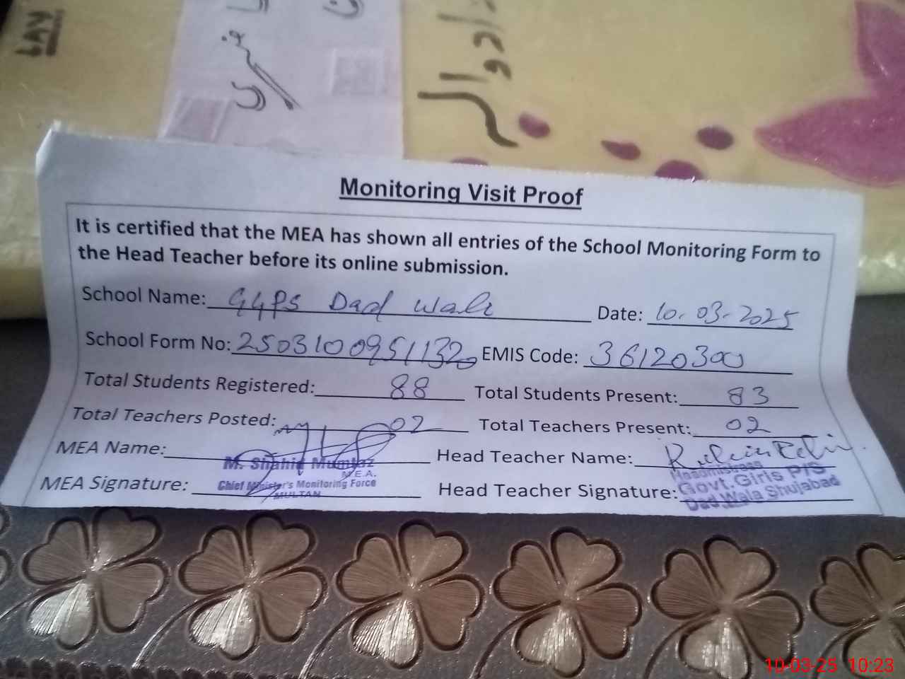 | EMIS Code: 36120300 | Name of School: GGPS DAD WALA SHUJABAD DISTT. MULTAN | |||