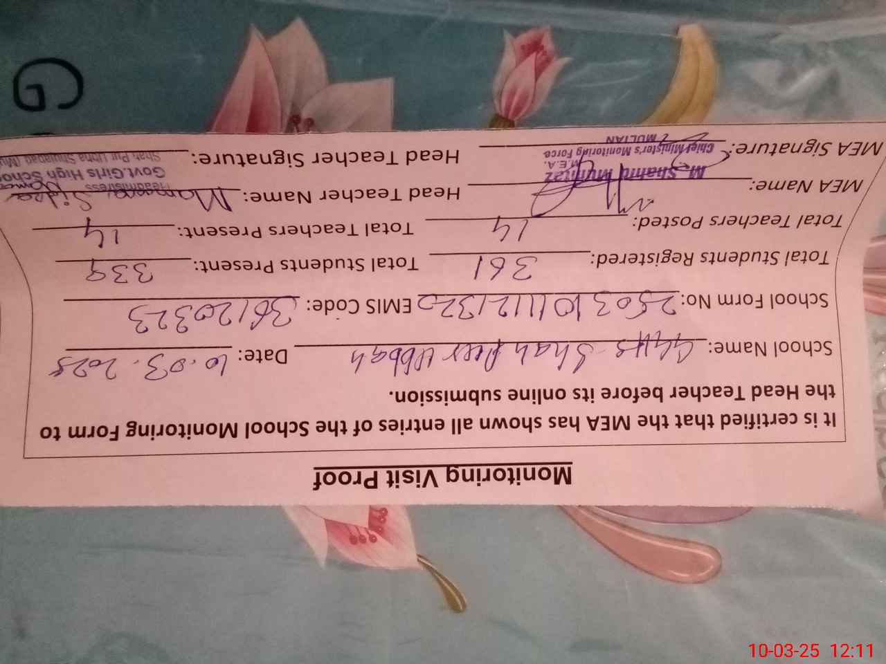| EMIS Code: 36120323 | Name of School: GGHS SHAH PUR UBBHA SHUJABAD | |||