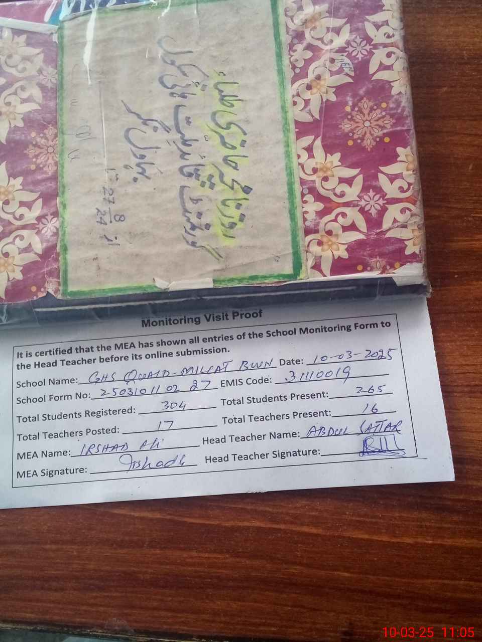 | EMIS Code: 31110019 | Name of School: GHS QUAID MILLAT BWN | |||