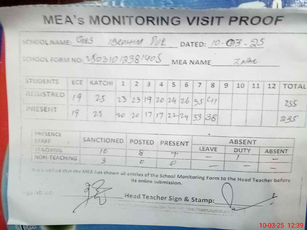 | Attendance Register | Head Teacher | MEA with School | Visit Proof |