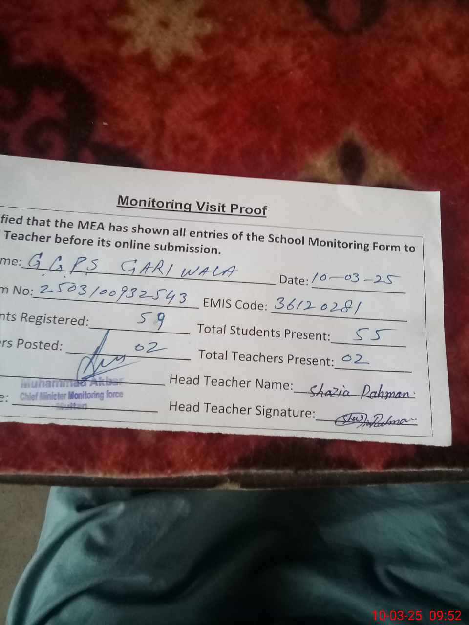 | Attendance Register | Head Teacher | MEA with School | Visit Proof |